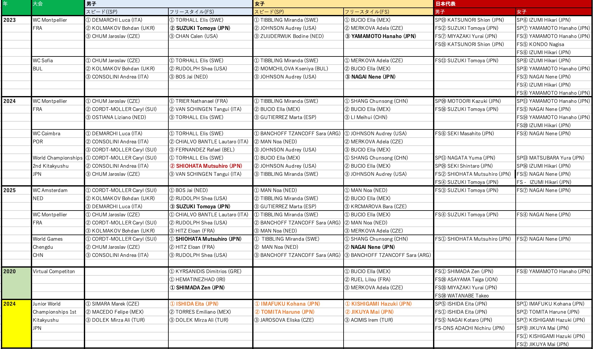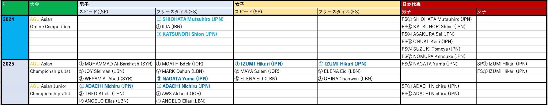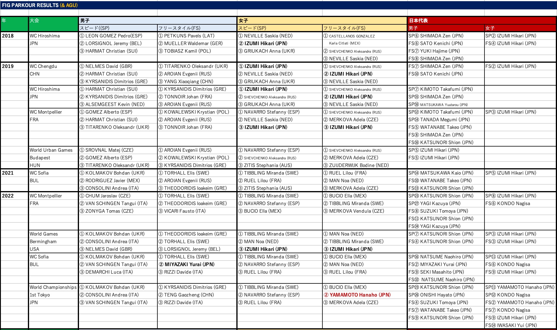2018年から始まったFIG (WORLD GYMNASTICS) のパルクール公式大会及び2024年から始まったAGU(アジア体操連盟)公式大会のメダリストと日本代表の結果一覧です。